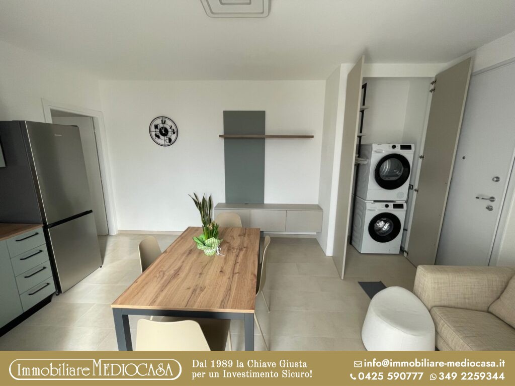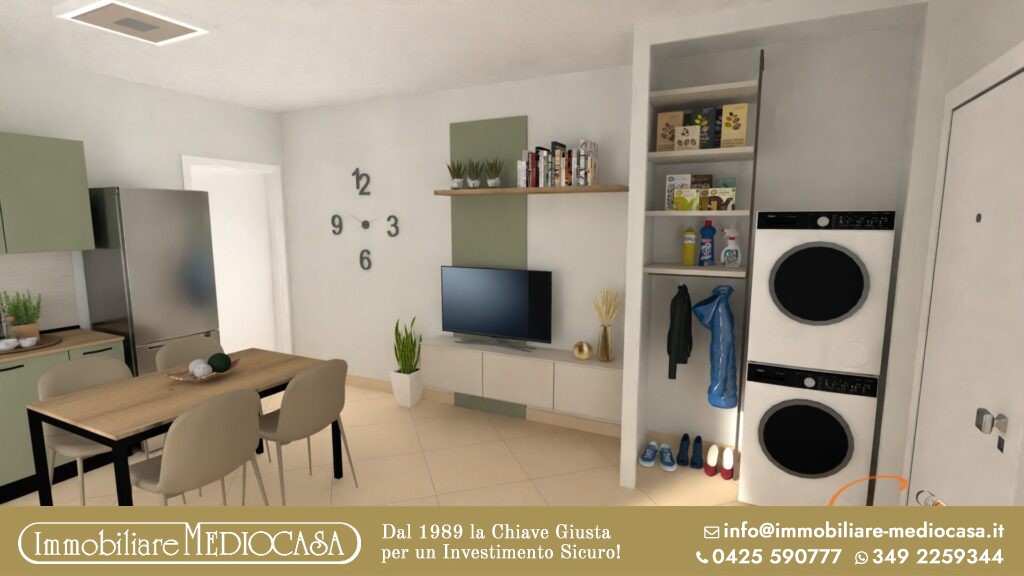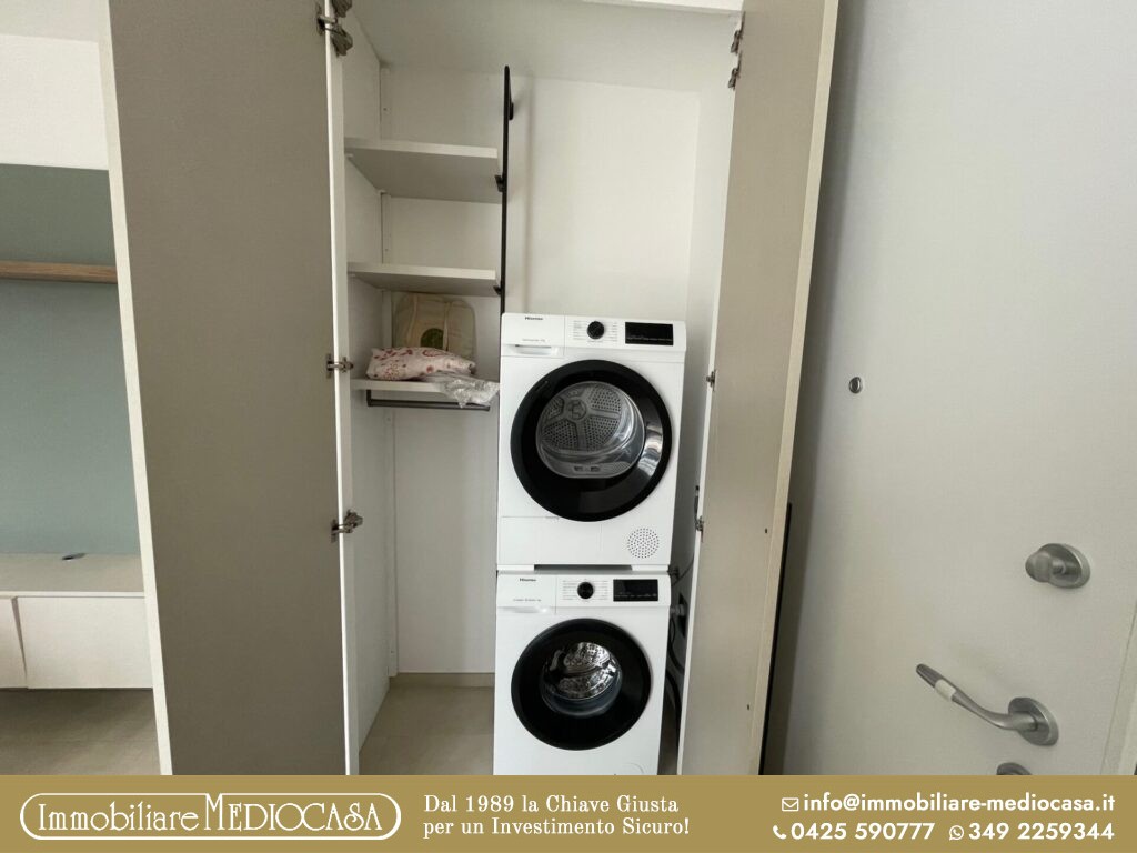 Un valore aggiunto dell’appartamento è la presenza di uno spazio lavanderia a scomparsa, perfettamente integrato, completo di lavatrice, asciugatrice e guardaroba, pensato per ottimizzare gli spazi senza rinunciare alla funzionalità.