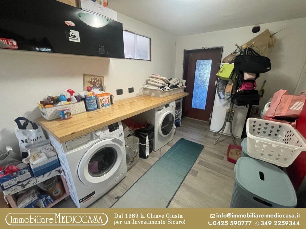 Al piano terra si trovano due camere matrimoniali – una al momento utilizzata come cabina armadio – un bagno con vasca idromassaggio, una comoda lavanderia, un ripostiglio nel sottoscala e una stanza multifunzione attualmente adibita a taverna, ma già predisposta per diventare una seconda cucina grazie alla presenza degli attacchi.