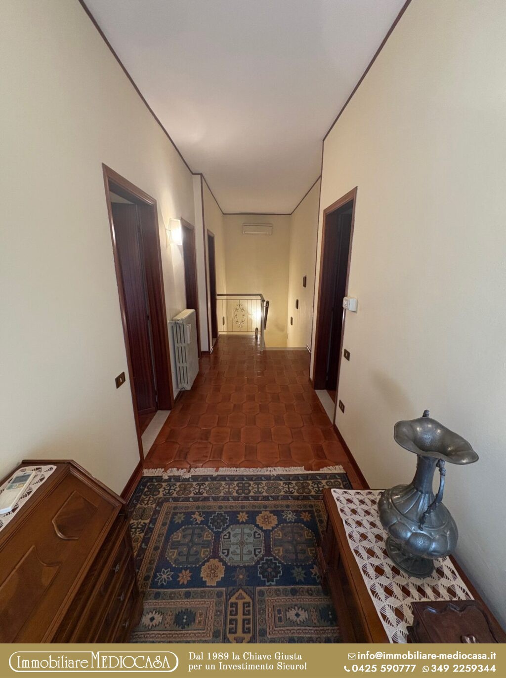Al piano primo/zona notte, troviamo 4 camere da letto e un bagno, rese comunicanti da un ampio ballatoio che – tramite un terrazzino – si affaccia sulla corte della proprietà.